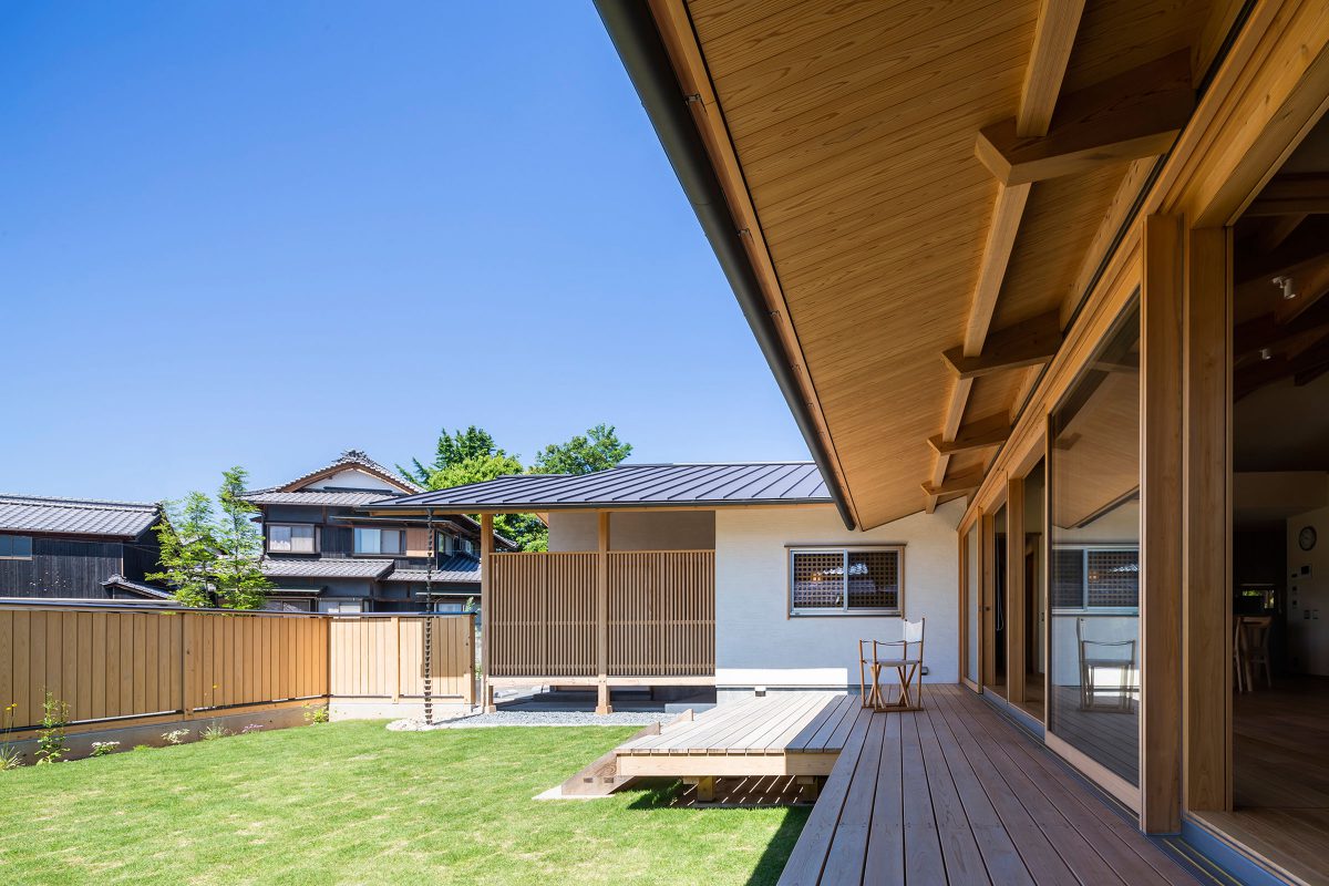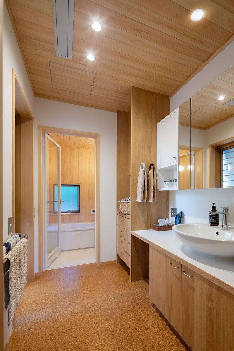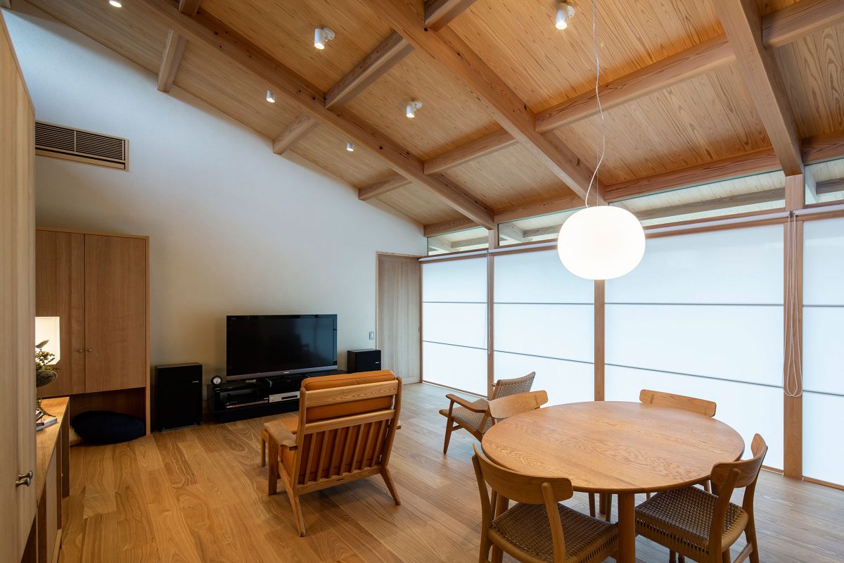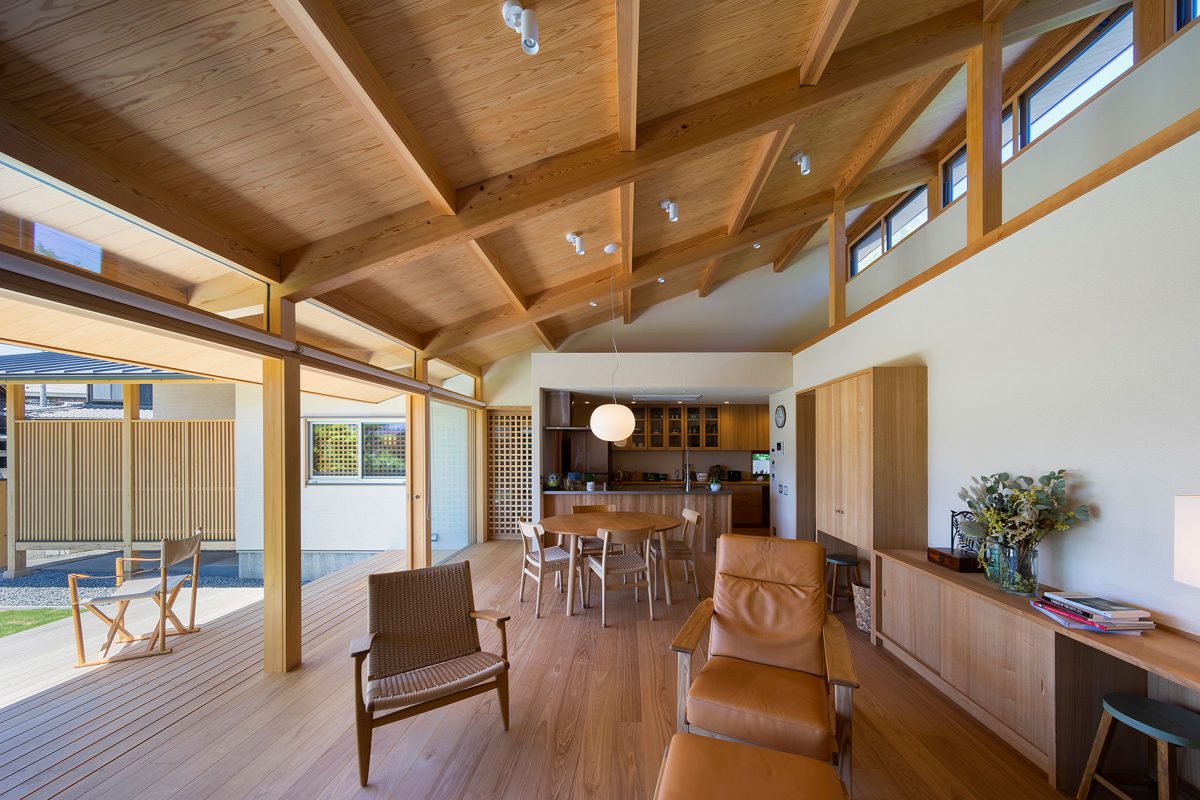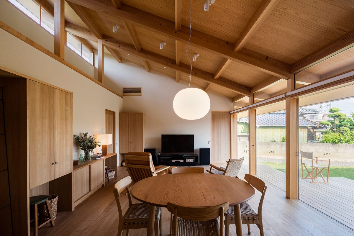 The living room is positioned at the best possible spot within the spacious lot. The large glass doors can be opened wide to allow for the interior and exterior to be enjoyed as a pleasant unified space. The dog can run across the large wooden deck and the grass lawn. A window placed high at the north side of the living room can be opened and closed using a controller, and it lets refreshing breezes from the yard flow in.