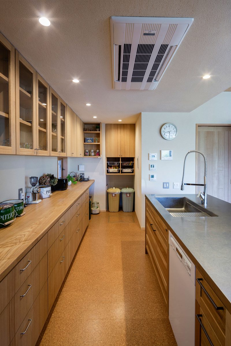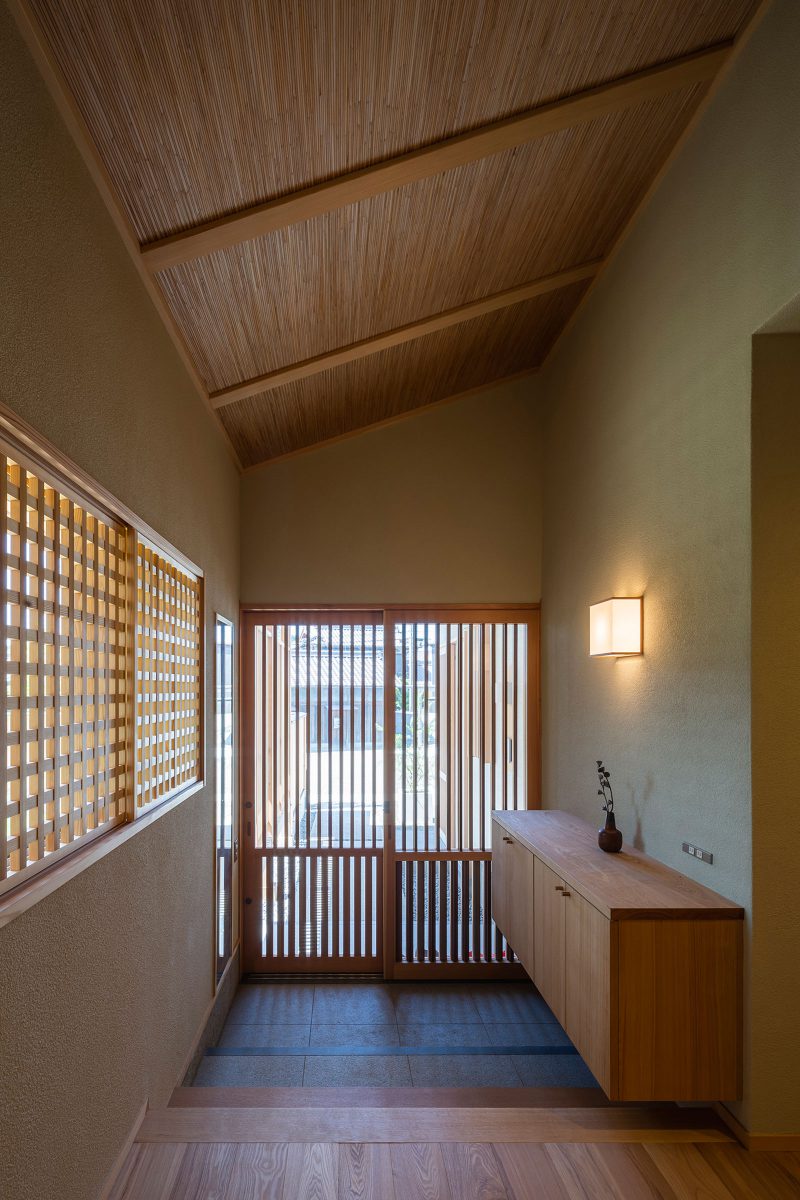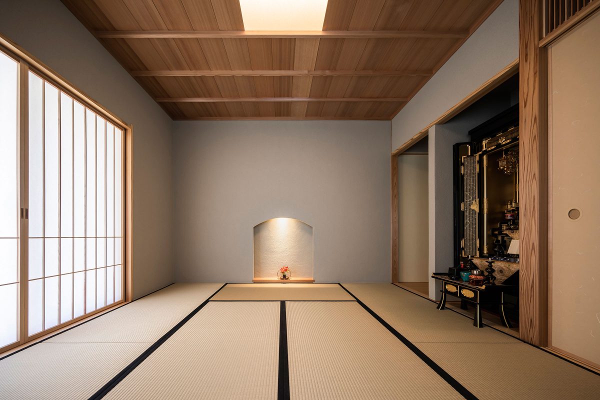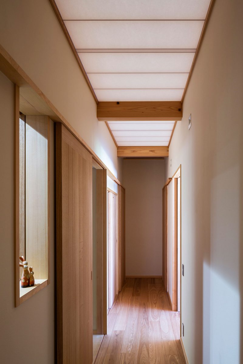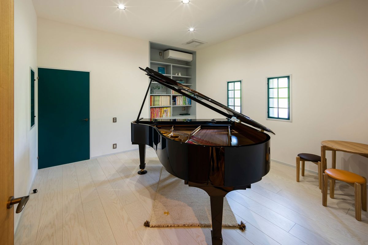The kitchen is placed at the center of the traffic flow line so that it is access-friendly for cooking, chores, and piano lessons. An important part of the design is the compact arrangement that makes for smooth mobility from the entrance to the kitchen and piano room, to the living room and Japanese-style guest room. Additionally, a dedicated entranceway was arranged on the side of the piano room through which students can directly enter and exit, enhancing the independence of the respective spaces.
