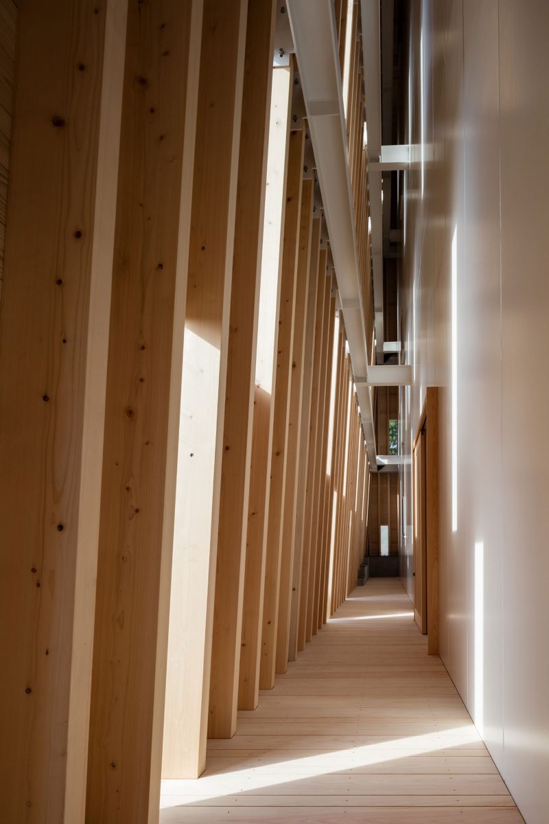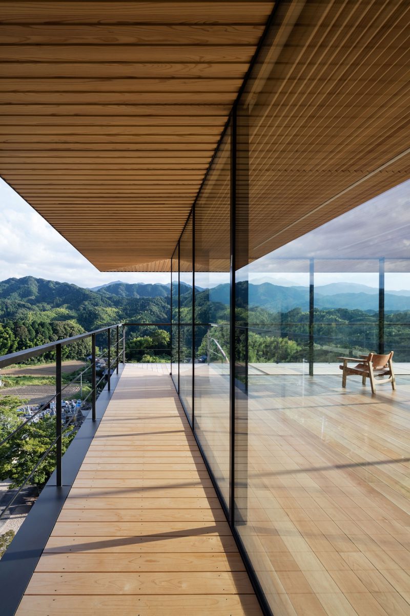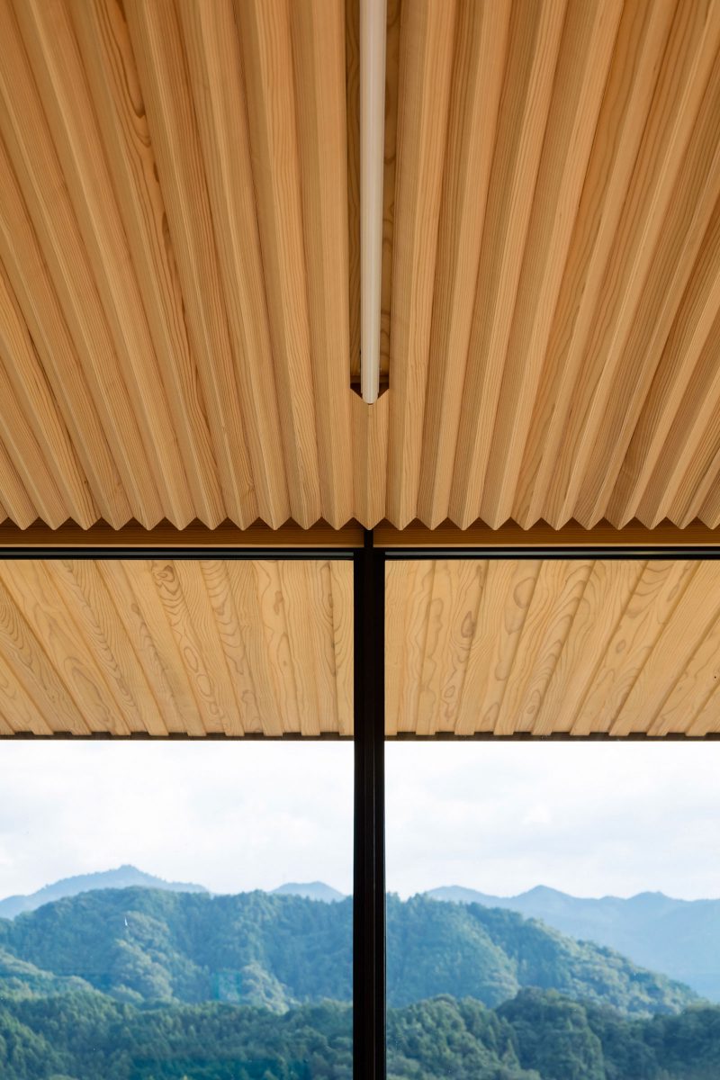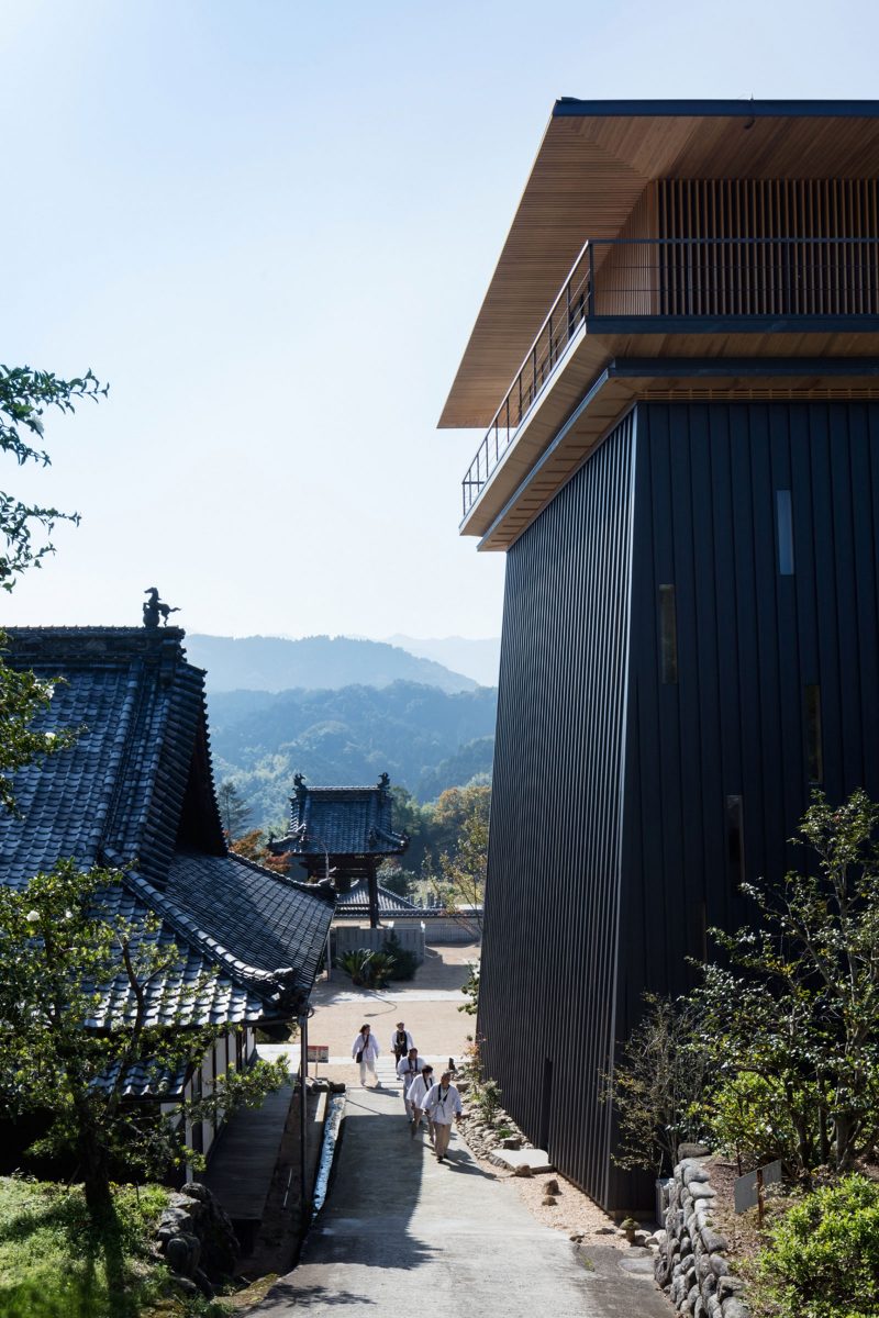 On a steel framework, around 800 cypress rafters are extended diagonally and left exposed, much like a hakama (traditional Japanese skirt-like garment), and 88 pieces of glass are fitted randomly. The number “88” is the same as the number of sacred spots visited on an ohenro pilgrimage made around Shikoku. The space created as a result becomes a corridor of light, a place for calming one’s spirit. The colors of the lights shift and change throughout the year, depending on the rich nature that surrounds the temple grounds. The structure architecturally expresses the spirit of shogyō mujō, a fundamental Buddhist doctrine which teaches that all things are impermanent.