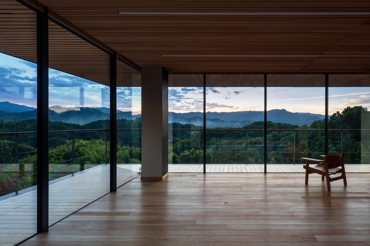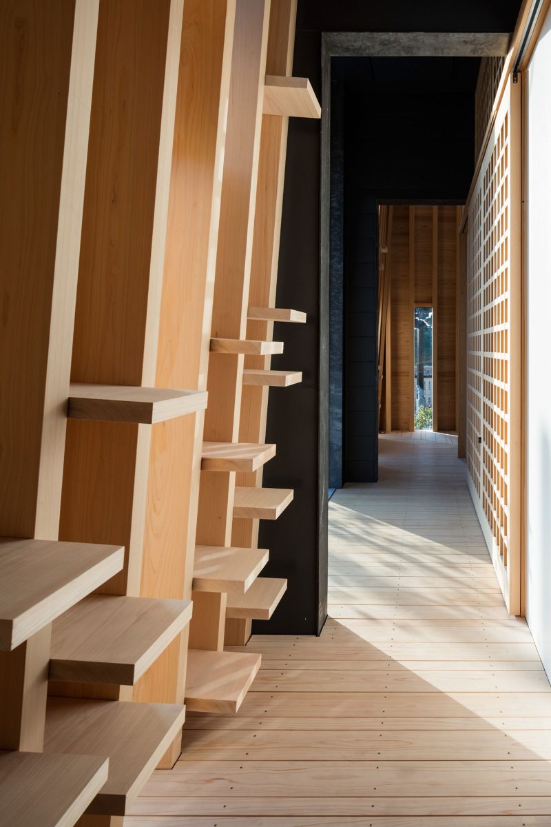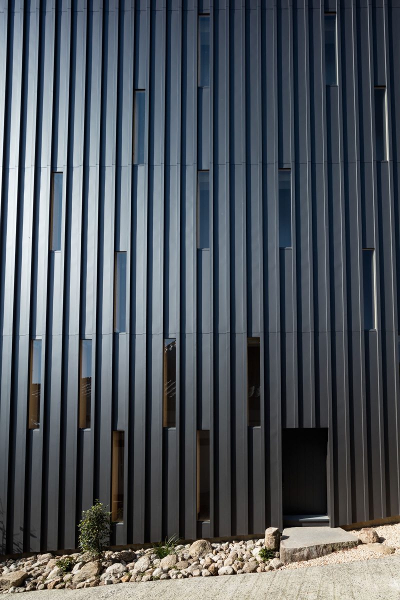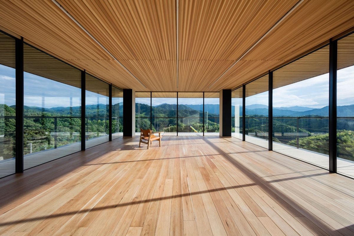 On a steel framework, around 800 cypress rafters are extended diagonally and left exposed, much like a hakama (traditional Japanese skirt-like garment), and 88 pieces of glass are fitted randomly. The number “88” is the same as the number of sacred spots visited on an ohenro pilgrimage made around Shikoku. The space created as a result becomes a corridor of light, a place for calming one’s spirit. The colors of the lights shift and change throughout the year, depending on the rich nature that surrounds the temple grounds. The structure architecturally expresses the spirit of shogyō mujō, a fundamental Buddhist doctrine which teaches that all things are impermanent.