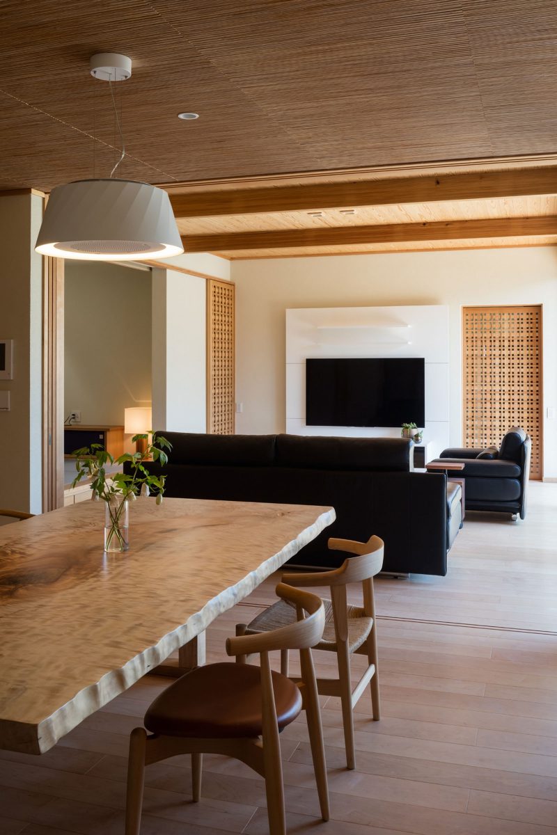 The living area is an open and dynamic space with decorative beams, whereas the natural reed cladding on the dining area and kitchen ceilings creates a calming effect.