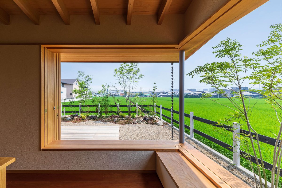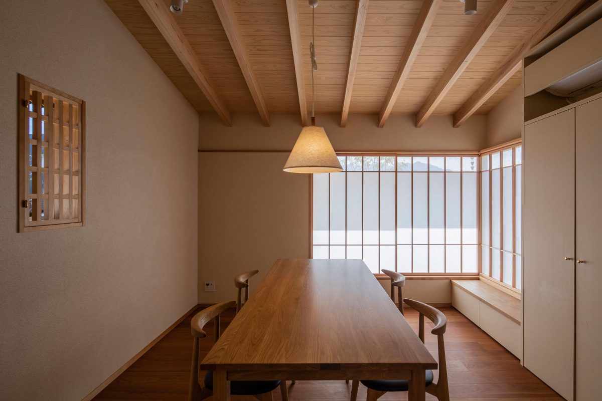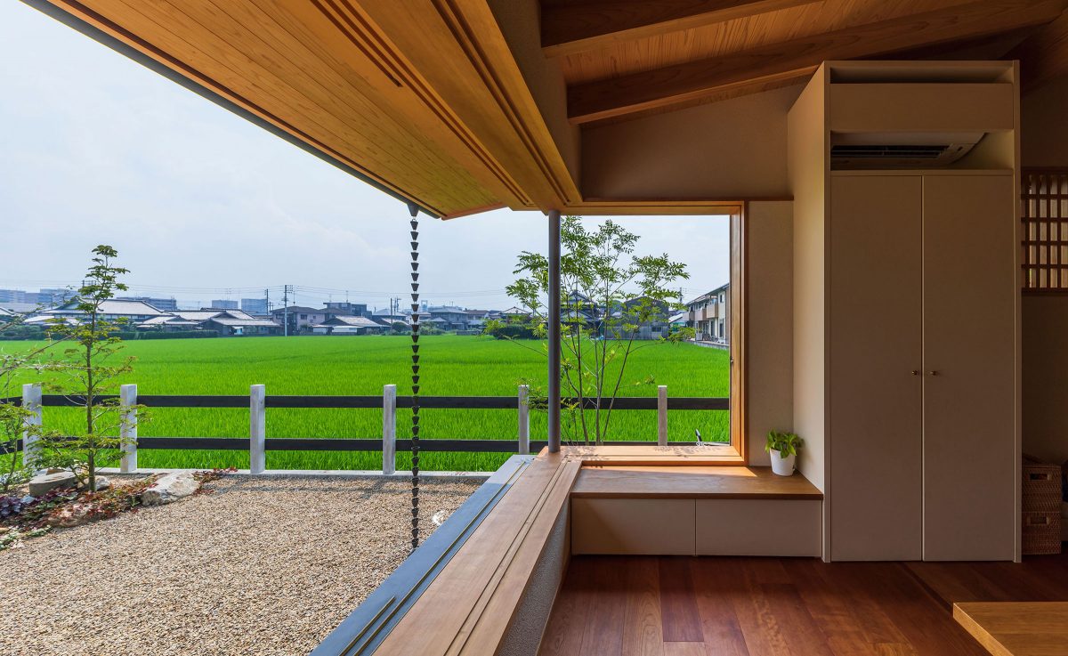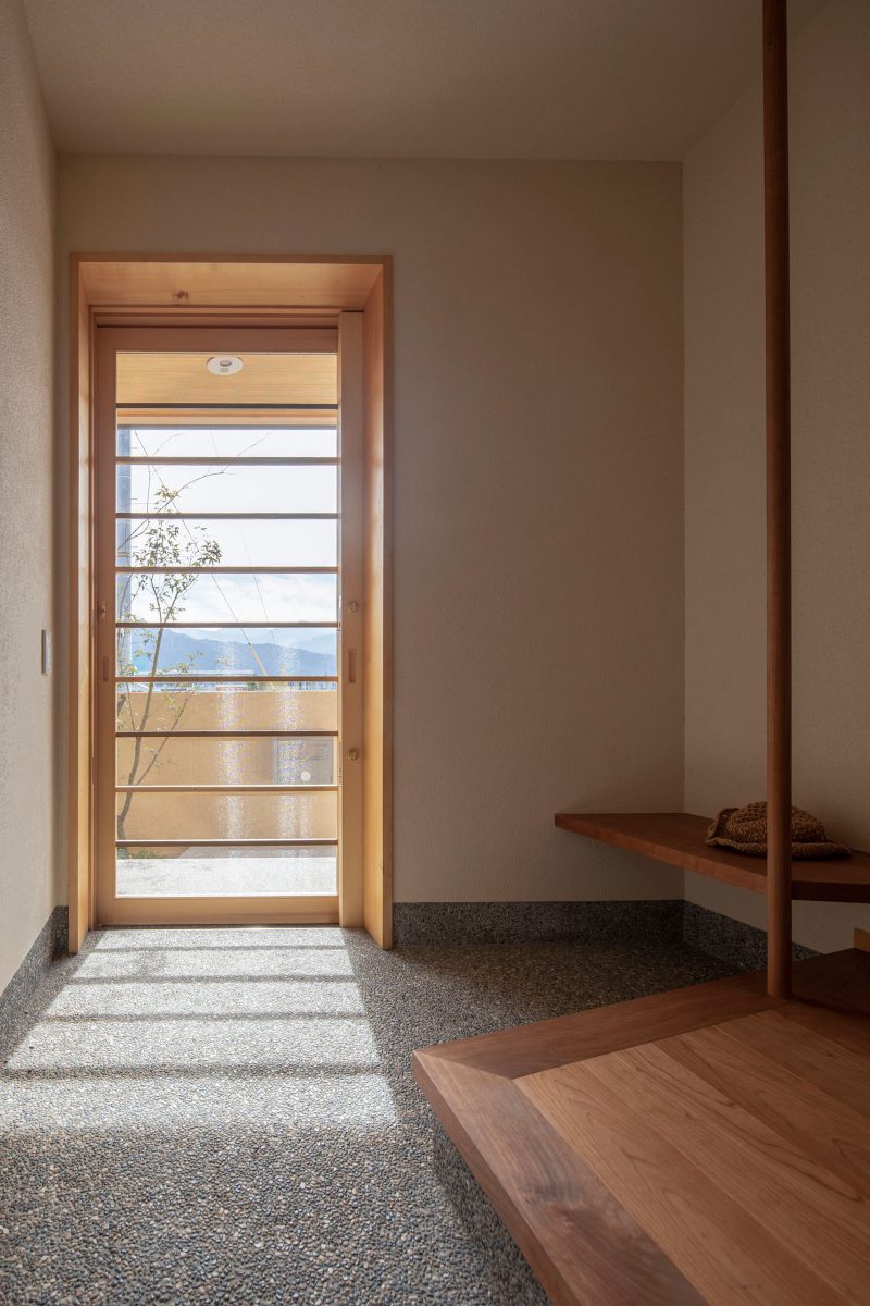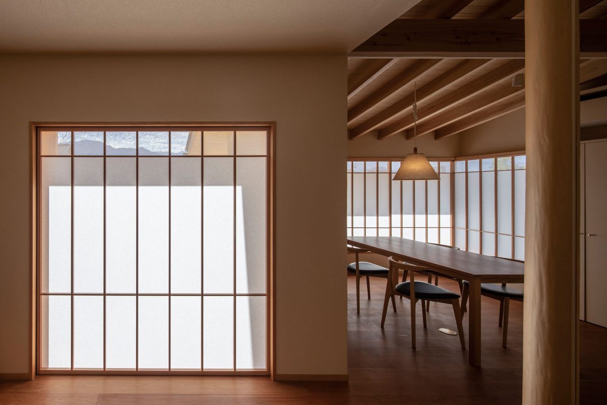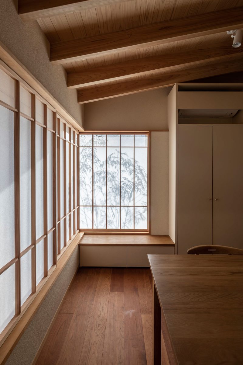 Design features offer the enjoyment of gradations ranging from open viewing to closed from sight: a glass door that appears virtually not there… a screen door centering the space, fitted with a low crossrail… shōji screens papered with see-through washi at upper portions only. From the single opening of the in-wall space where they can be stowed all give options for different ways to set off the space.