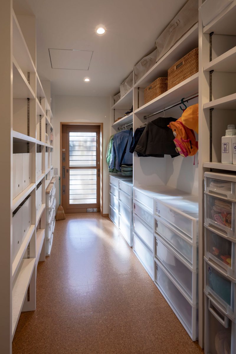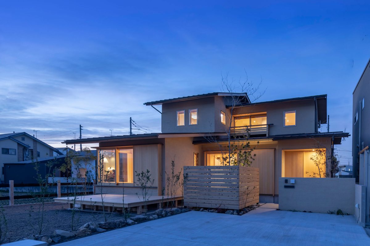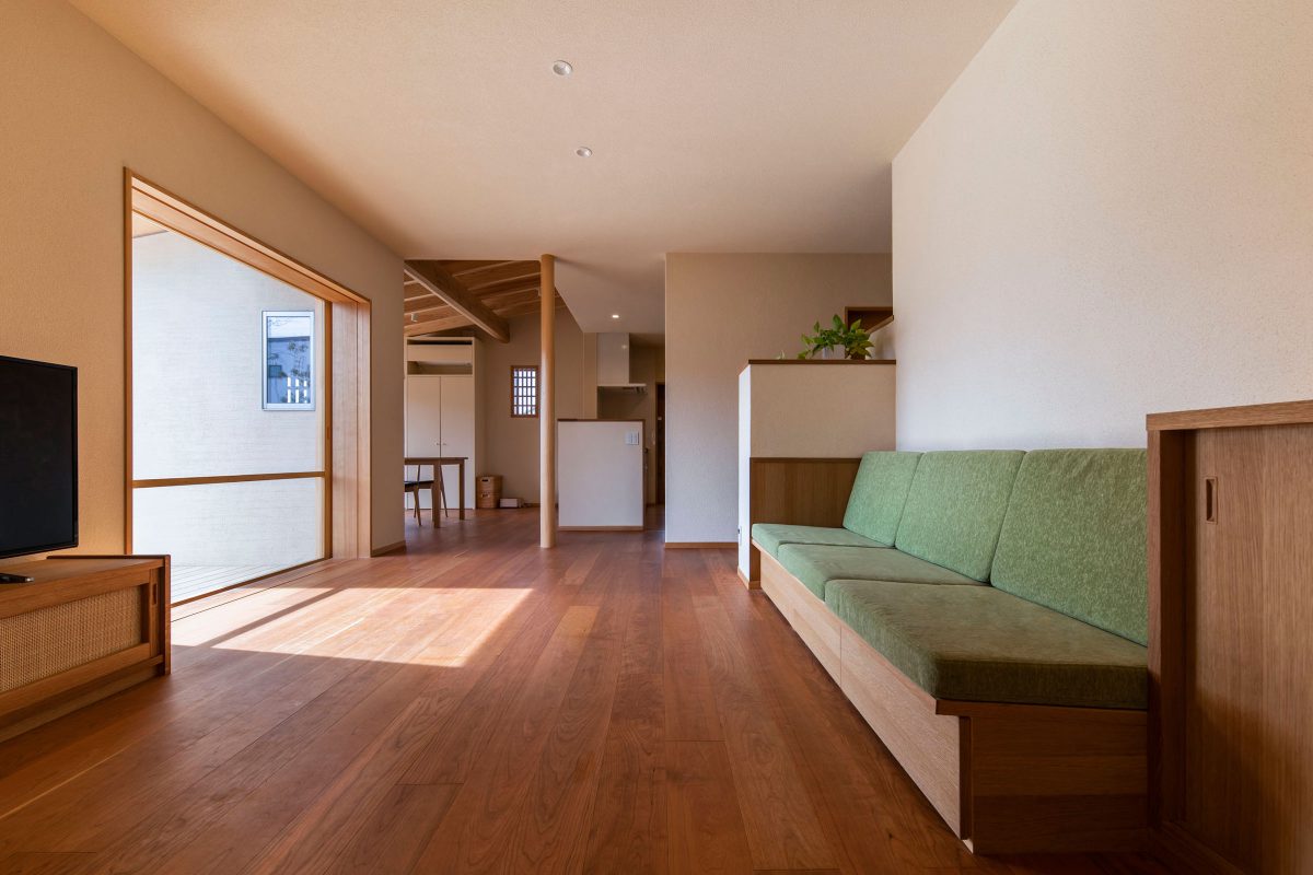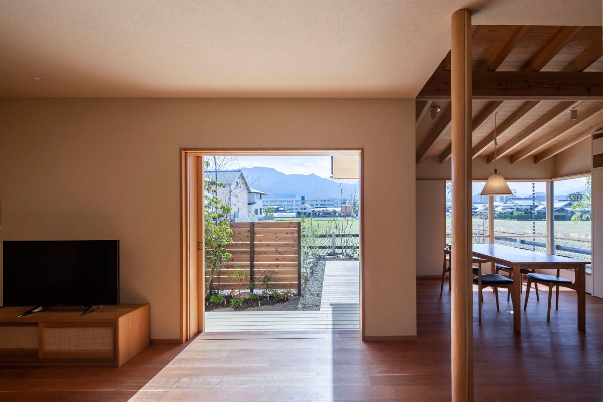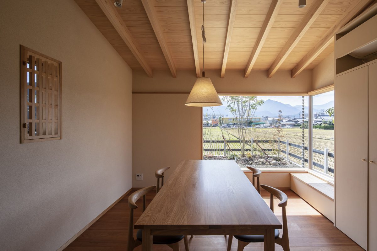 Design features offer the enjoyment of gradations ranging from open viewing to closed from sight: a glass door that appears virtually not there… a screen door centering the space, fitted with a low crossrail… shōji screens papered with see-through washi at upper portions only. From the single opening of the in-wall space where they can be stowed all give options for different ways to set off the space.